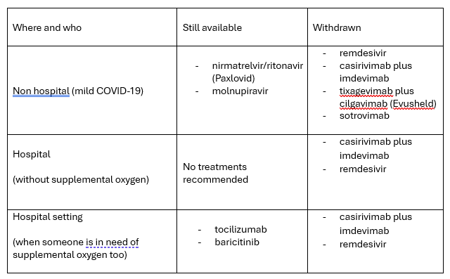 In the community (non-hospital) setting, for the treatment of immunocompromised people with mild COVID-19, access to molnupiravir and remdesivir will be withdrawn. This means that paxlovid will continue to be available. Sotrovimab will be withdrawn in February 2026. NICE also looked at two treatments which weren’t previously approved in this setting, tixagevimab plus cilgavimab (Evusheld) and casirivimab plus imdevimab, but decided not to recommend these for NHS use.